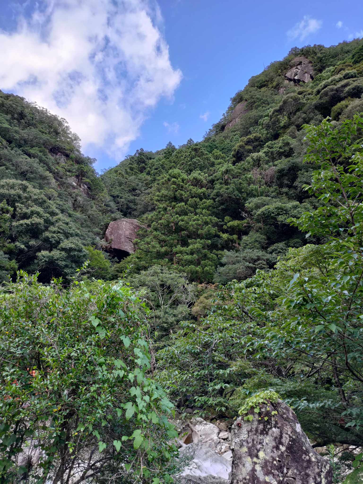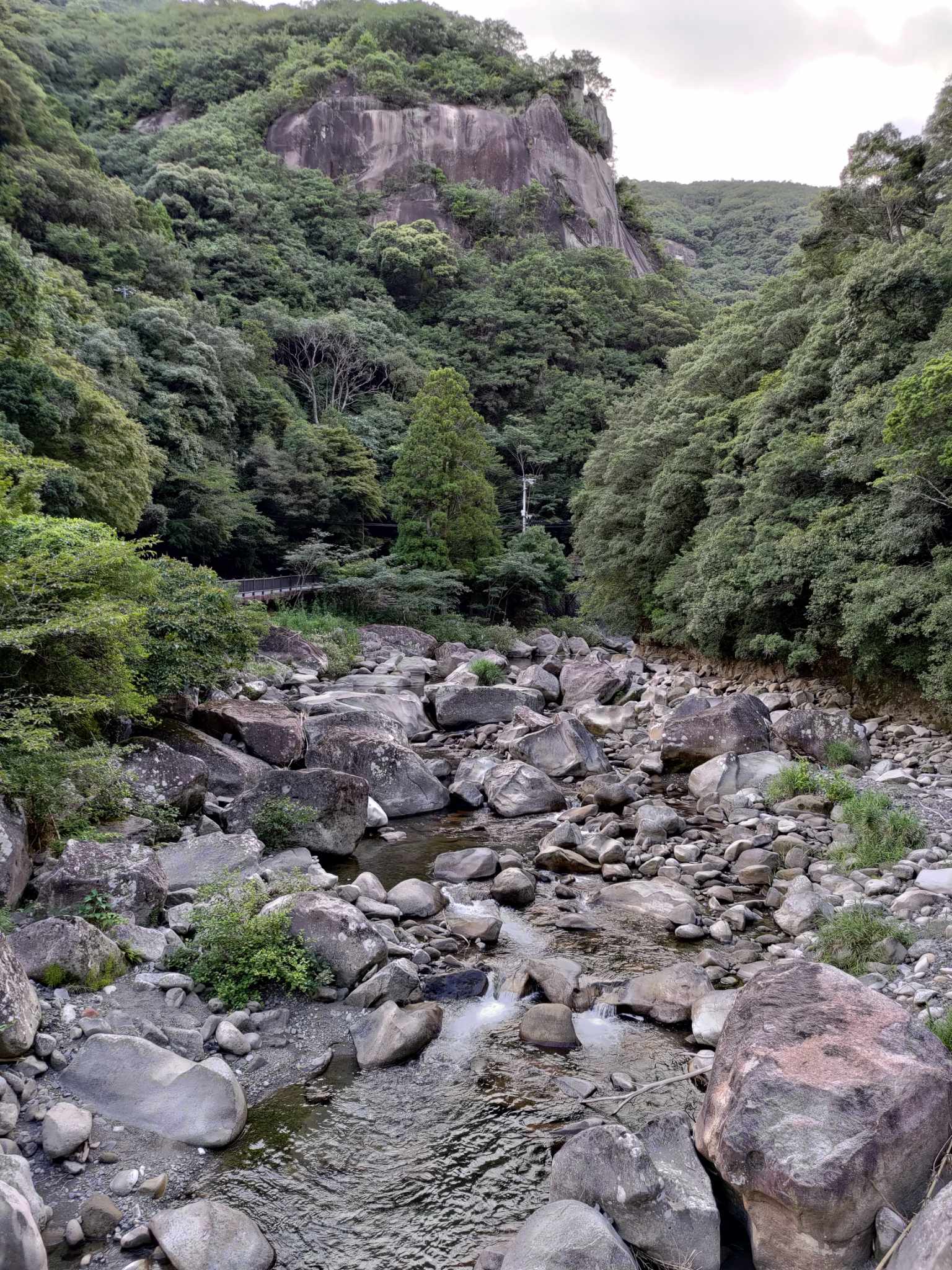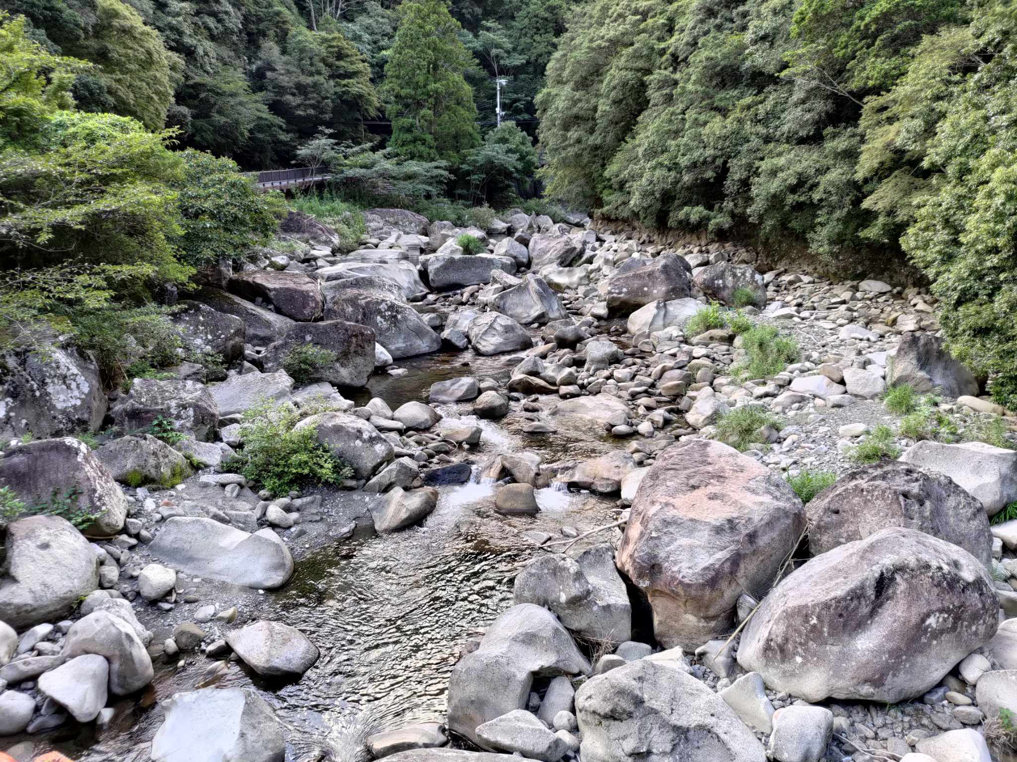 産総研の地質図を調べたところ、この特徴的な岩々は砂岩らしい。風化して崩れ落ちてきた砂岩がこの谷筋にたまるのだろう。しかし和歌山の中部以南は谷筋が多いように思う。造山運動が生み出した山と谷だろうか。